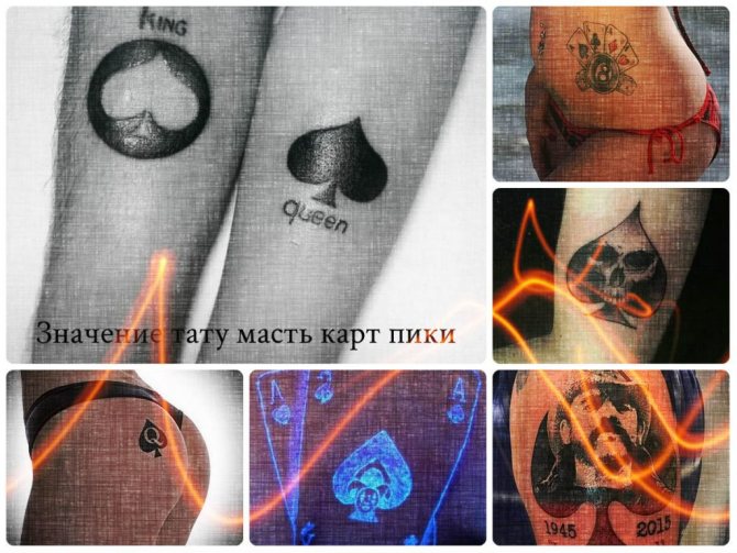 Les principales significations des piques dans les tatouages sont l'excitation, le triomphe, la chance et la réalisation d'objectifs. Les dessins réalisés avec eux peuvent inciter à ne pas manquer l'instant et à vivre pleinement la vie. Il y a des filles parmi les connaisseurs des jeux de cartes. Outre l'amour du jeu, les tatouages avec des piques chez les femmes peuvent évoquer l'athéisme et la croyance en la chance.