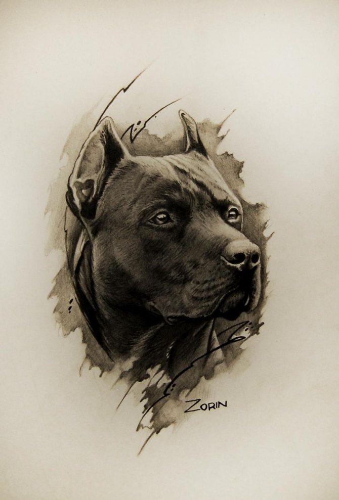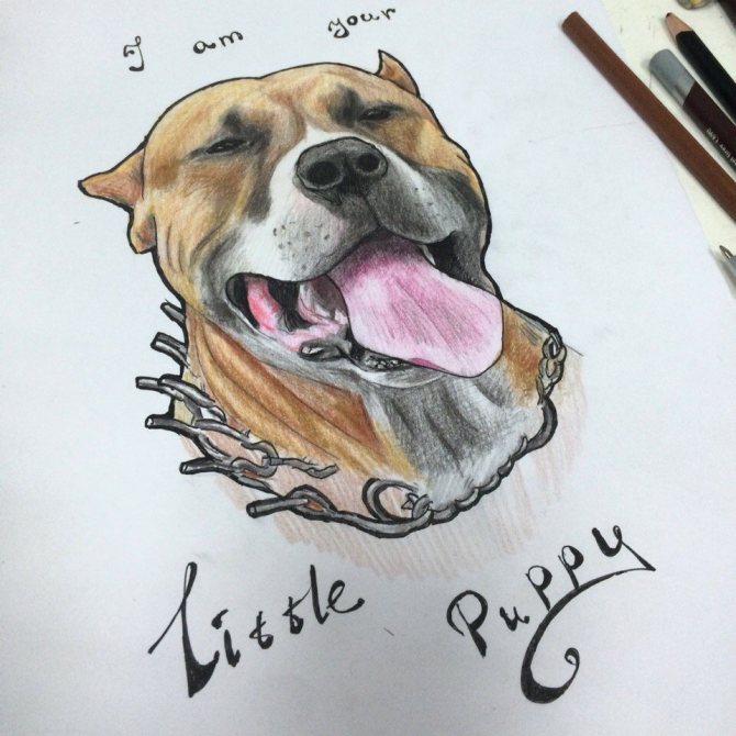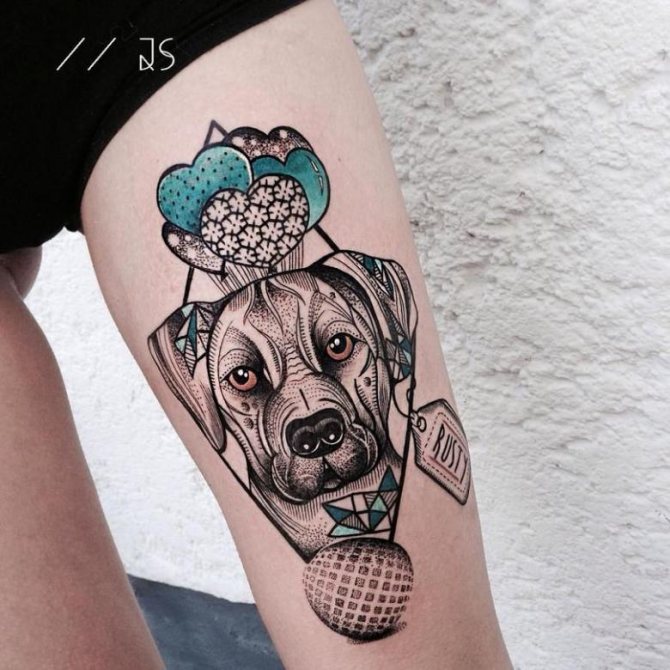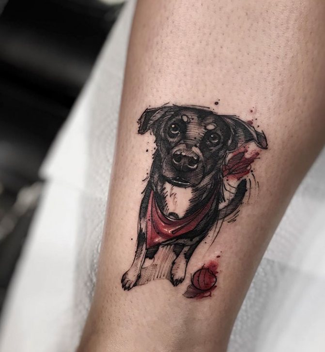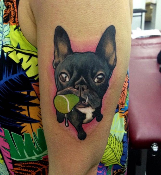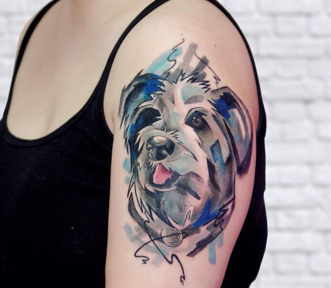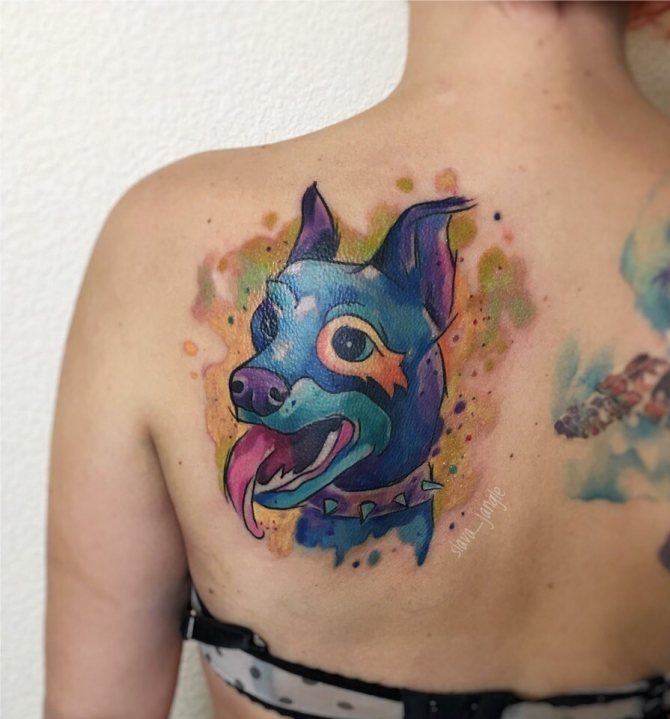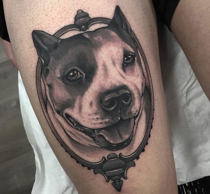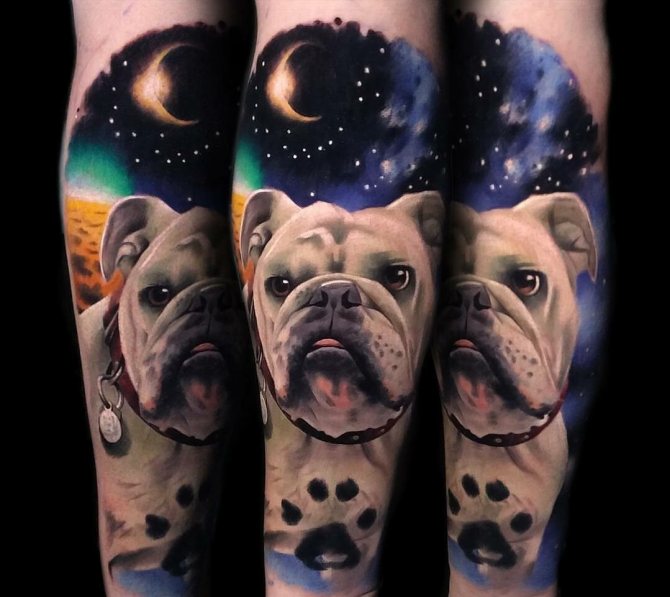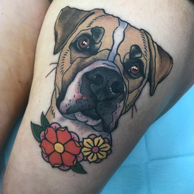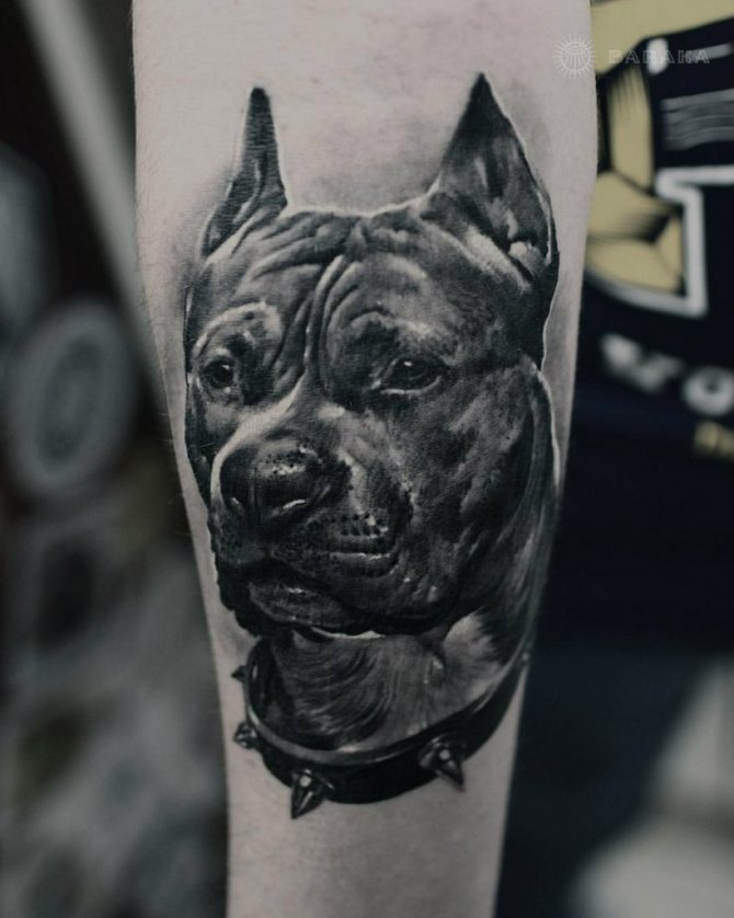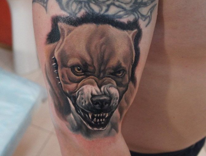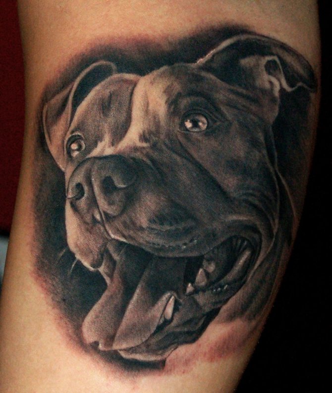- Un Pit Bull - le propriétaire d'un tel tatouage doit avoir une grande force physique et mentale. C'est aussi une image populaire parmi ceux qui possèdent cette race de chien. Lors du choix du croquis, la préférence est donnée à l'image complète du chien et à l'image de sa tête. Un chien dessiné dans un style cartoon est un signe de gentillesse et de sincérité et montre l'amour qu'une personne porte à son animal.