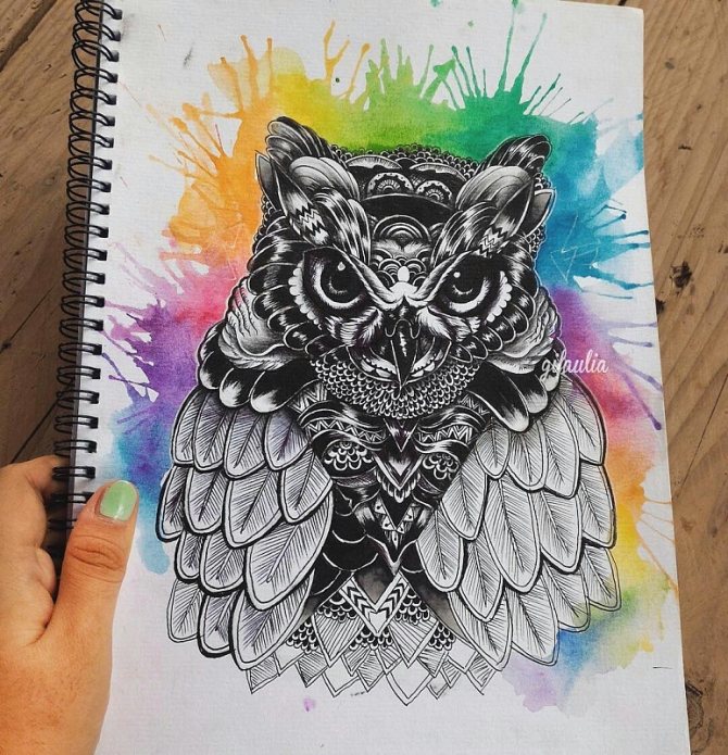 - Une chouette, représentée dans son apparence habituelle, signifie la puissance et l'amour de la vie. Les oiseaux dessinés avec des défauts inhabituels ou avec des parties de leur propre corps d'une taille irréaliste indiquent un renoncement à l'agitation habituelle de la vie.