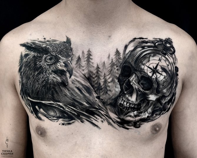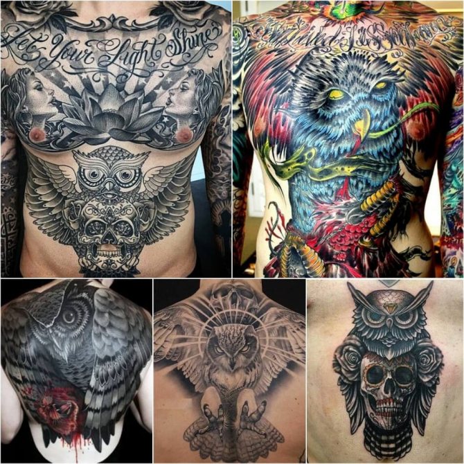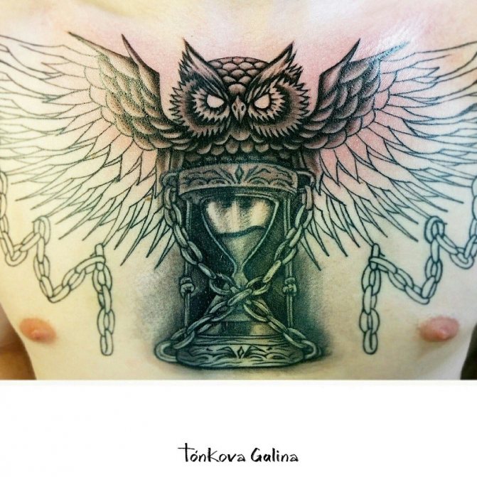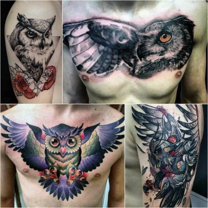 L'emplacement le plus populaire pour les tatouages de hiboux masculins est la poitrine. Un oiseau sauvage en vol, aux ailes déployées, a l'air majestueux et parfois même intimidant. Les tatouages avec des hiboux conviennent aux introvertis, aux personnes qui préfèrent la solitude et sont enclines à la réflexion.