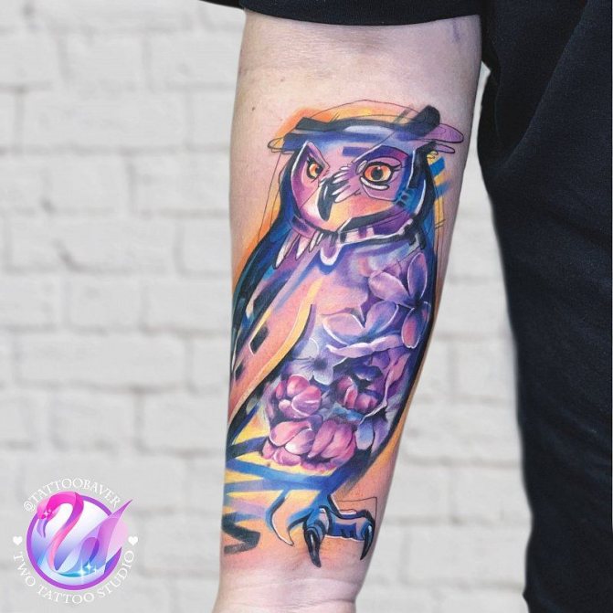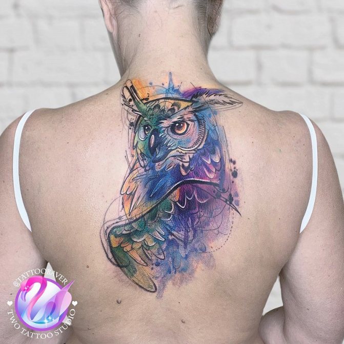 Tatouage avec une chouette On préfère souvent faire comme les hommes et les femmes. Il s'agit d'un tatouage particulièrement frappant et magnifiquement conçu dans les styles old-school et aquarelle.