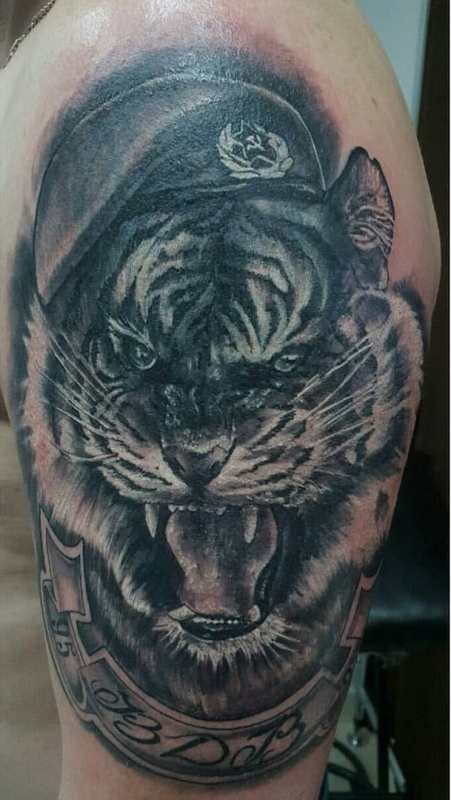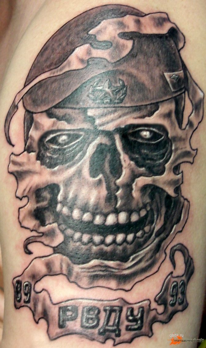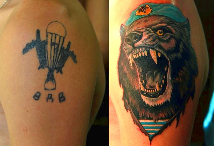 Chaque unité militaire a sa propre tradition de tatouage. Par exemple, les conscrits d'automne se font tatouer un dragon, tandis que les conscrits de printemps se font tatouer un aigle. Ceux qui ont servi dans le tatouage du Caucase du Nord tatouage de scorpion de l'armée.Le tatouage d'un scorpion, le dard d'un guerrier pointé vers le haut. Les tireurs d'élite se font tatouer un terroriste sous le fusil, les éclaireurs un hibou ou une chauve-souris. Les soldats des forces spéciales doivent avoir une apparence intimidante, c'est pourquoi ils ont souvent un tatouage de loup sur l'épaule, un crâne, un léopard, etc. Pour les parachutistes, le tatouage est un must.
