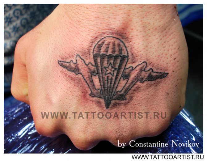L'un des plus populaires sont les tatouages pour les troupes aéroportées, qui, dans la plupart des cas, sont inscrits sur la côte de la main gauche. Beaucoup pensent que cette tradition a de longues racines et que sa signification peut être interprétée de différentes manières.