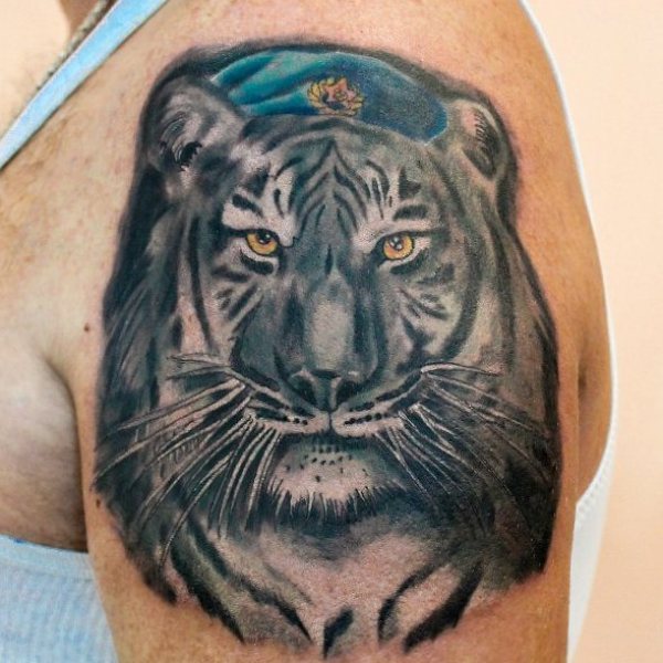 Non moins populaires sont les images de loup et de tigre dans un béret, qui ont une signification sémantique presque identique. Dans la plupart des cas, ces animaux sont représentés avec un sourire, prêts à tout moment à mettre en action leurs longs crocs acérés.