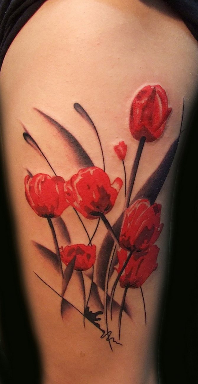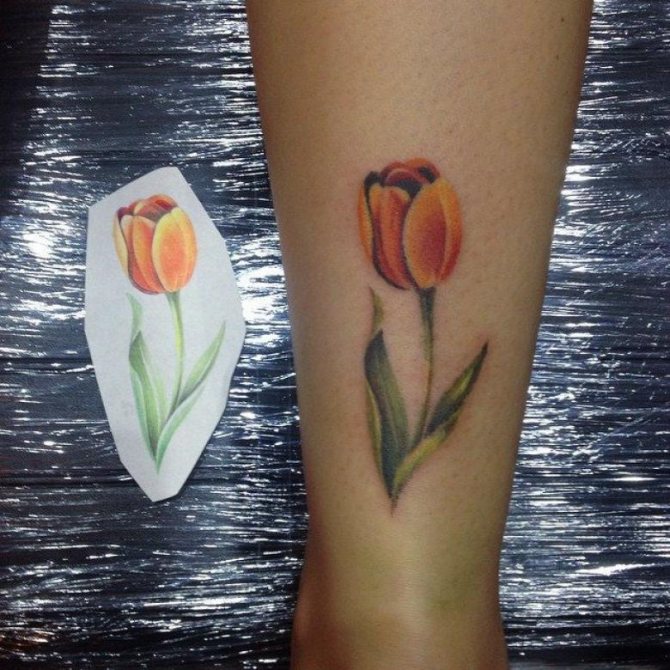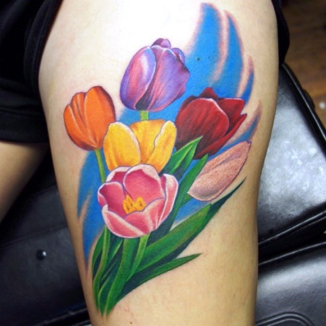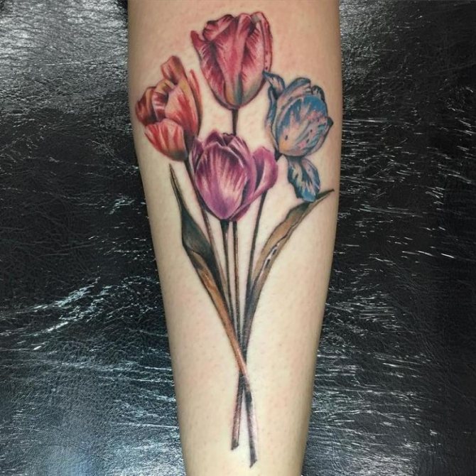 - Le réalisme. Vous aimez les petits détails ? Alors ce genre est pour vous. Aide à recréer la tulipe dans toute sa gloire, en tenant compte de chaque petite différence. Mais ! pour un tatouage plus spectaculaire de ce plan, vous devez choisir de grandes surfaces.