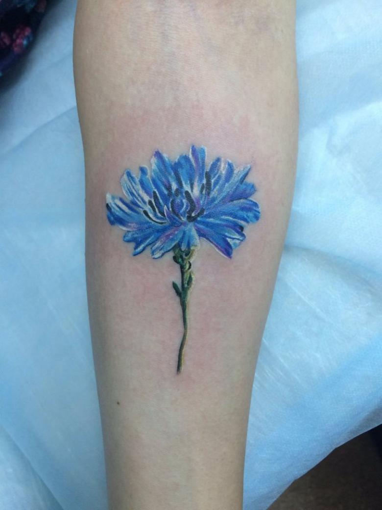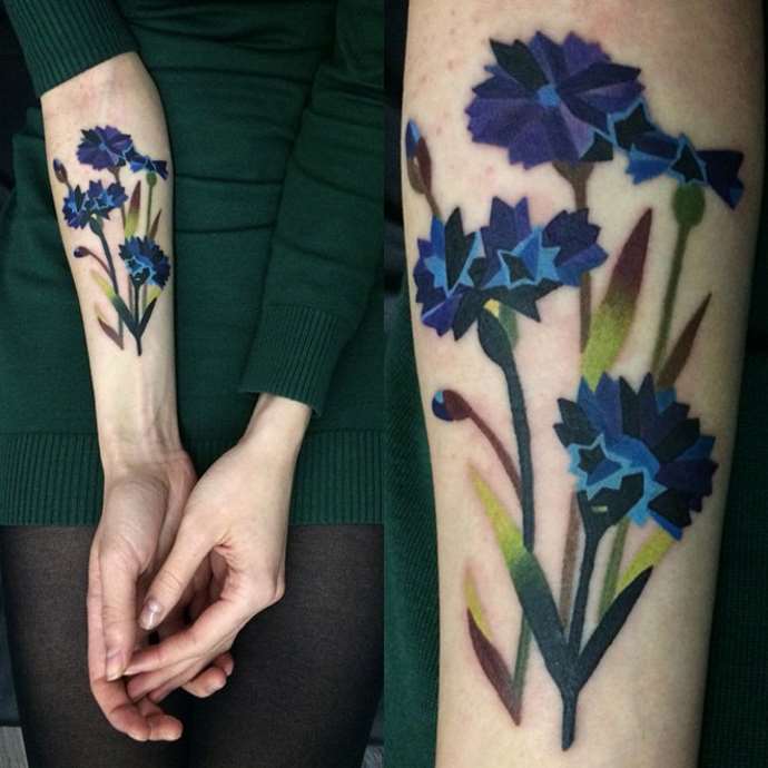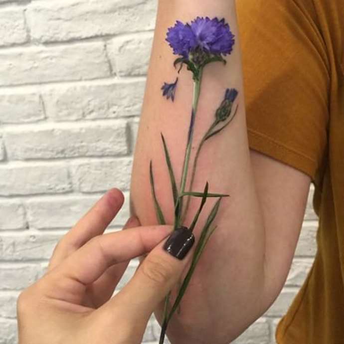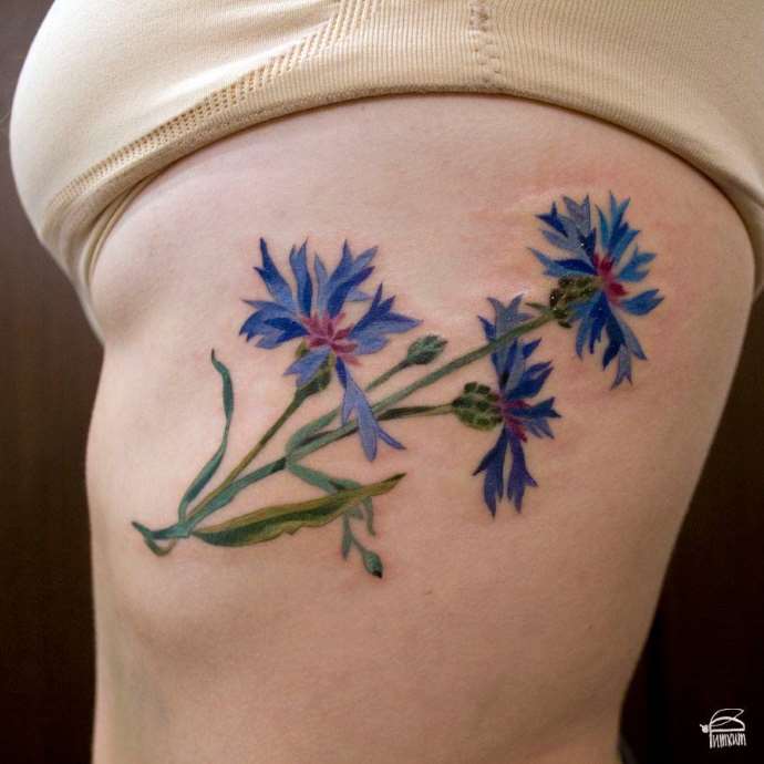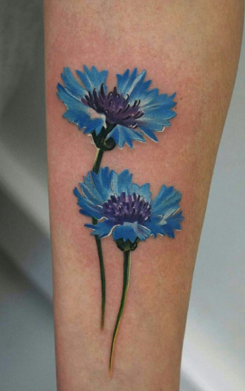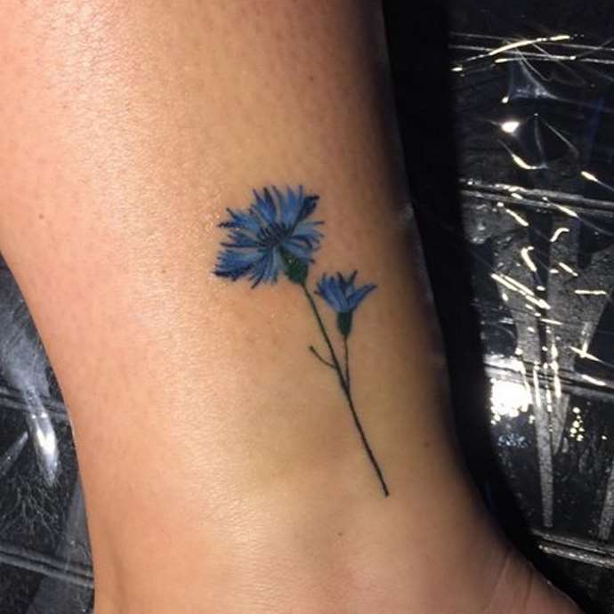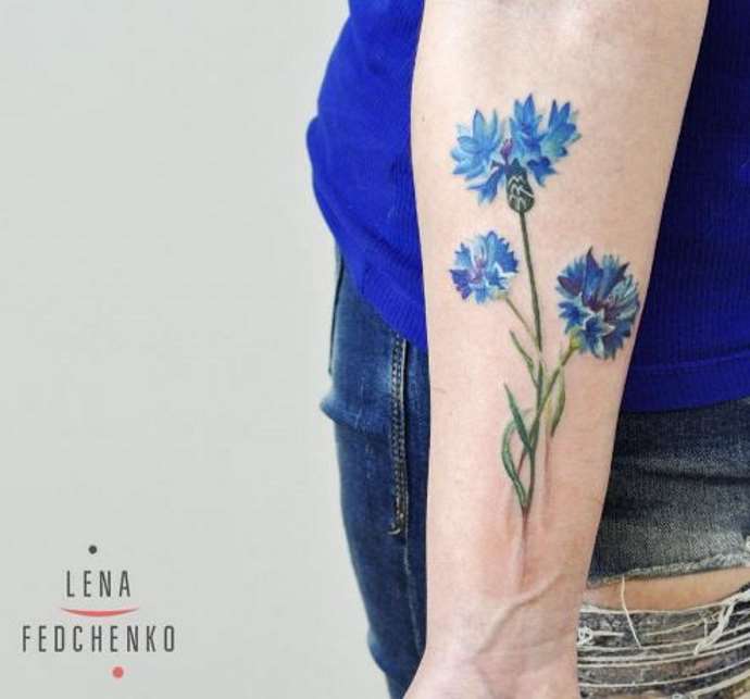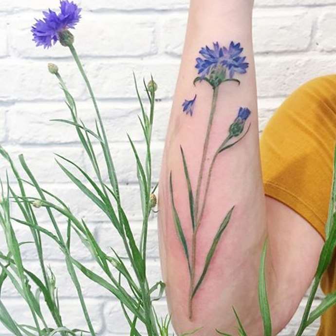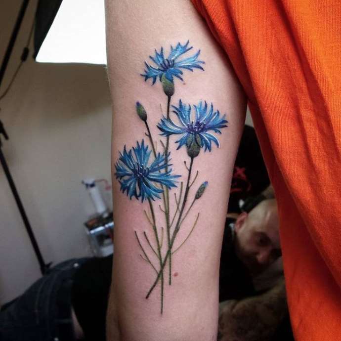 Le bleuet symbolise la pureté, la tendresse, l'honnêteté. Le tatouage avec son image est très populaire parmi les femmes et les hommes.