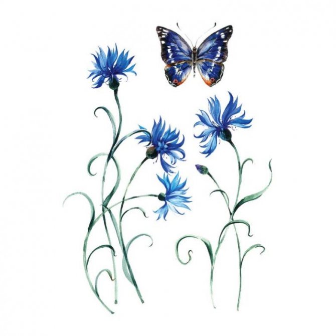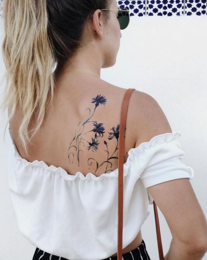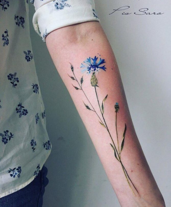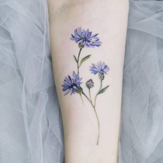 De plus, pour de nombreuses femmes, contrairement aux autres fleurs, le bleuet symbolise le caractère calme et tolérant du porteur du tatouage. En même temps, elle a un feu intérieur, une beauté, un noyau mental fort.