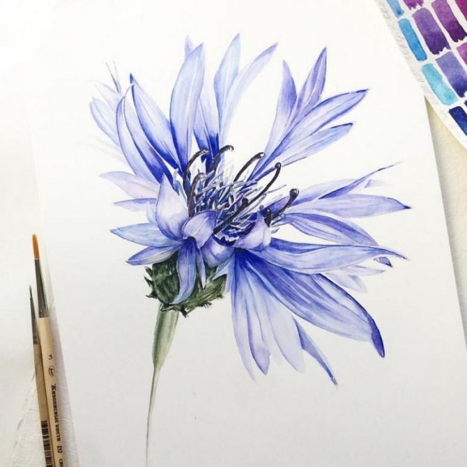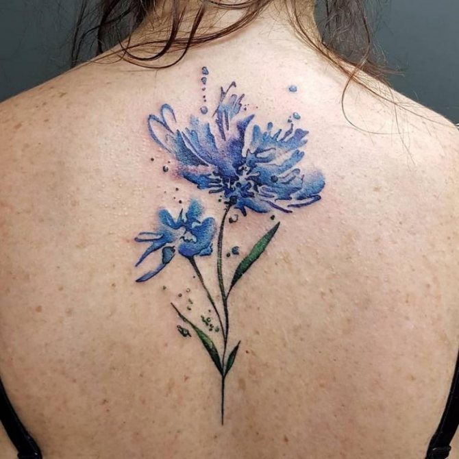 Le bleuet sera magnifique dans le style aquarelle. La palette de couleurs vives, les lignes fluides et la légèreté - ces caractéristiques confèrent au tatouage un charme et une tendresse particuliers. Le pinceau de l'artiste semble avoir touché le dessin.