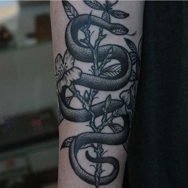 La solution stylistique doit être déterminée par le choix de l'esquisse. Les filles choisissent souvent une vigne enroulée autour de leur jambe, de leur épaule ou de leur bras (voir photo ci-dessous). Dans ce cas, un style baroque avec des motifs originaux, une dentelle complexe et une ornementation compliquée est plus approprié. Les tatouages monochromes peuvent également être élégants.
