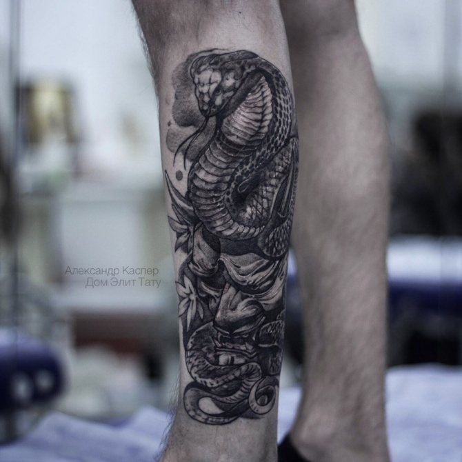 Afin de montrer un trait tel que l'intelligence, le serpent est dessiné dans un état calme et équilibré, sur son visage, si vous regardez de près, vous pouvez dire qu'il a conçu, et il doit être très calme, ce qui à son tour montre le caractère calme du propriétaire du tatouage.