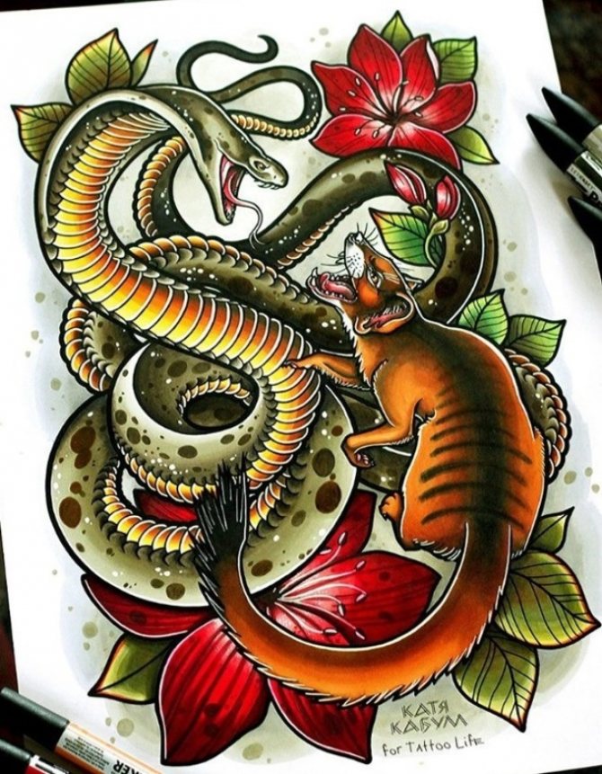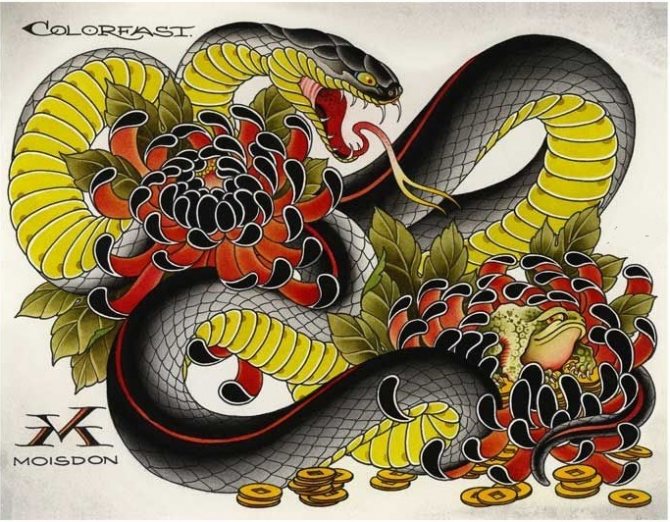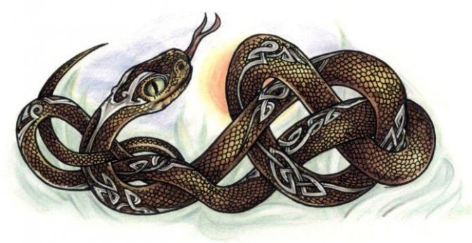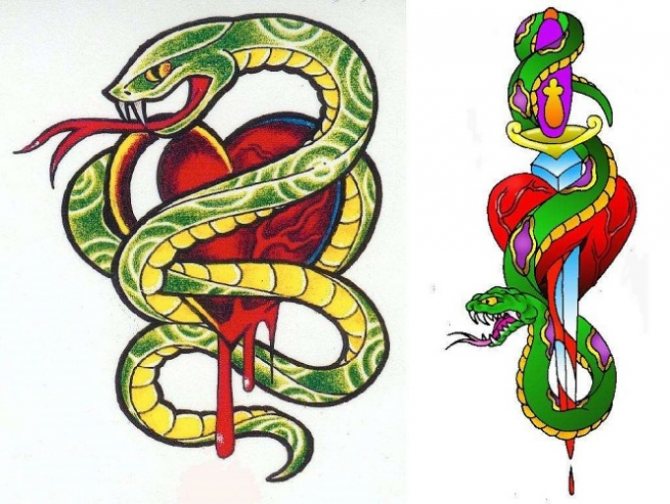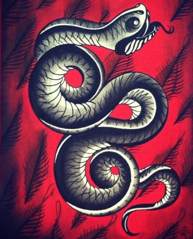 - L'une des significations les plus inhabituelles du mot "serpent" est... est la loyauté, dans ce cas, il s'agit du mariage. Dans ce cas, ce n'est pas seulement la femme, mais aussi son amant, qui s'empiffre du serpent. Les serpents "appariés" sont souvent entrelacés sur les tatouages.