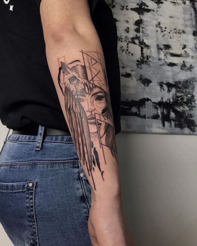 Le style de tatouage géométrique est l'un des styles les plus complexes. La technique du motif de la chouette utilise la zone la plus large du bras. Cela est dicté par le fait qu'il faut beaucoup d'espace pour représenter des formes géométriques. Un tatouage géométrique nécessite une mise à jour constante. L'application de lignes droites et précises requiert une concentration maximale de la part du maître et implique de s'adresser obligatoirement à des tatoueurs professionnels ayant une expérience professionnelle.