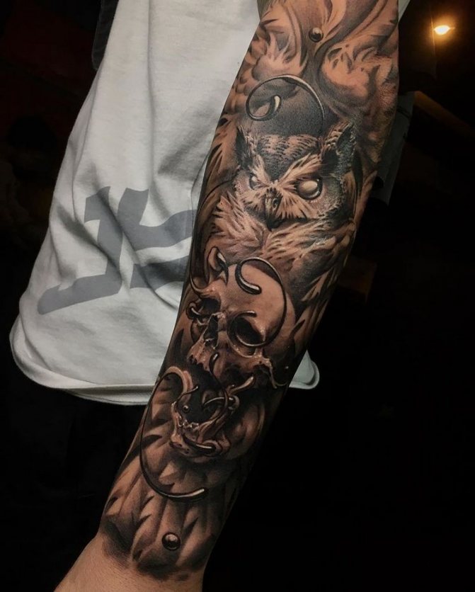 Pour réaliser un motif de hibou de style vintage, vous devez le positionner correctement sur votre main. La zone de l'avant-bras est la plus appropriée pour cela. L'image d'un hibou de grande taille, presque grandeur nature, devient une caractéristique des tatouages de style ornemental. Le tatouage est une grande image, presque grandeur nature, d'une chouette dans le style ornemental et ne peut être osé que par une femme déterminée et forte. Le tatouage s'étend généralement sur le bras, de la partie supérieure du bras au coude ou au poignet.