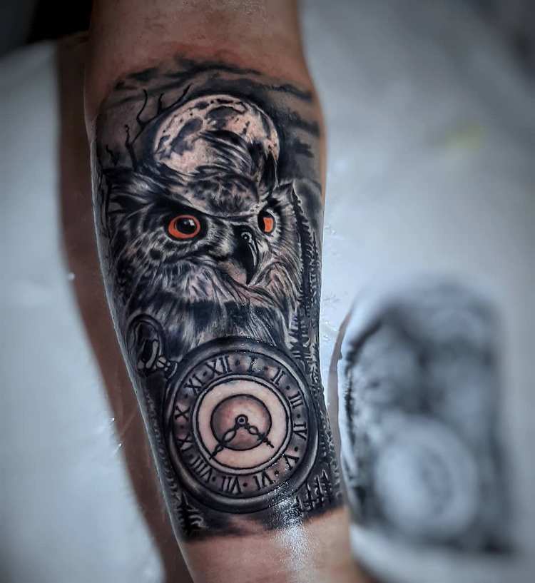 - L'image d'une chouette avec une horloge suggère que le porteur est conscient du caractère éphémère du temps de vie qui lui est alloué et qu'il apprécie chaque minute de sa précieuse vie.