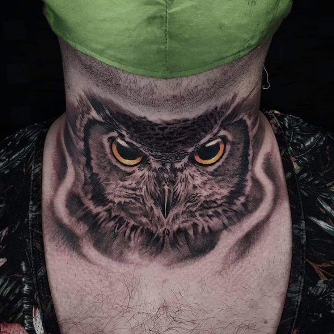 Souvent, le tatouage original d'une chouette puissante est réalisé par les membres du sexe fort. Les hommes choisissent plus souvent des images dans les tons noir et blanc sur un dos ou sur un sein. Parfois, ces tatouages sont faits pour la beauté, et parfois, en raison de leur signification symbolique particulière. En outre, un tel tatouage indiquerait que l'homme a déjà décidé du chemin de la vie.