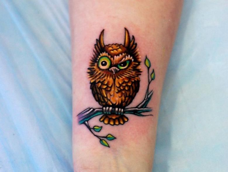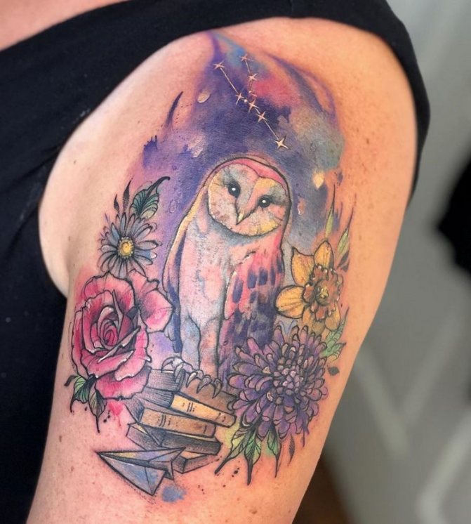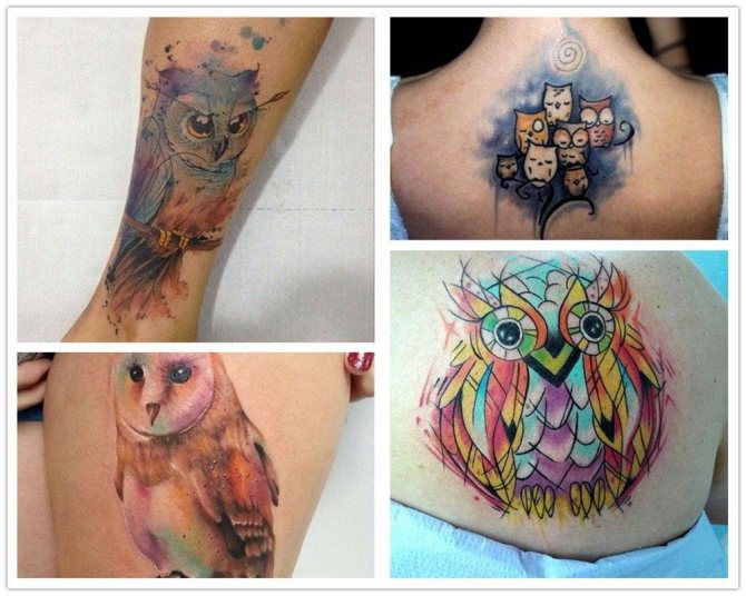 Une chouette représentée sur le corps d'une fille dans des couleurs vives évoque sa féminité et sa tendresse. En outre, la propriétaire d'un tel tatouage donne son consentement pour communiquer et faire connaissance avec elle.