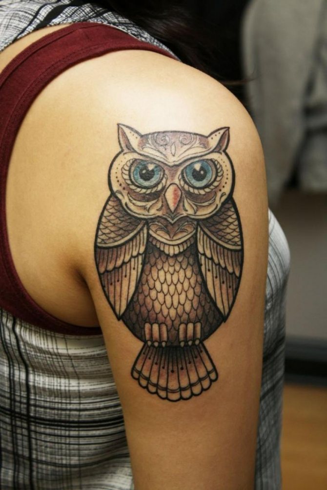 Les tatouages d'une chouette signifient la sagesse, la connaissance, l'expérience de la vie et la discrétion. Chaque personne a un rapport différent avec ces oiseaux. Les Japonais, par exemple, le considèrent comme un signe de malheur, tandis que les Chinois l'associent au symbole du "yang". Dans le passé, les hiboux étaient associés aux sorcières et à la sorcellerie en Europe et les oiseaux empaillés étaient utilisés pour faire fuir le mal dans le futur.