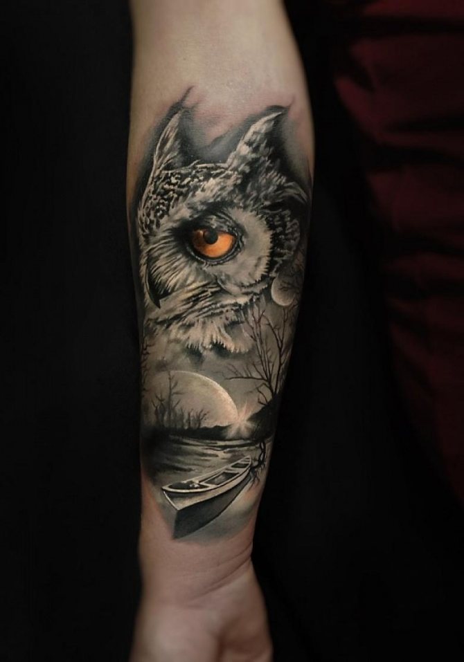 Le regard de la chouette, réalisé par un artisan professionnel avec du pigment noir, fait impression. Les tatouages en noir sont courants sur le poignet, près du pli du coude, sur n'importe quelle partie de l'avant-bras.