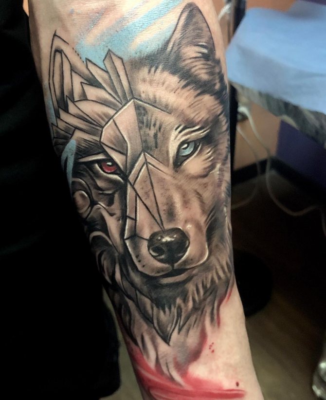 Les filles choisissent souvent des tatouages de loup de couleur vive. Appliquer le tatouage loup en tandem avec d'autres éléments, en choisissant la botanique.Tatouage loup sur le corps féminin, semble bon sur l'avant-bras, la poitrine, la jambe, dans l'omoplate. L'image symétrique d'un loup sur le dos est harmonieuse et audacieuse.