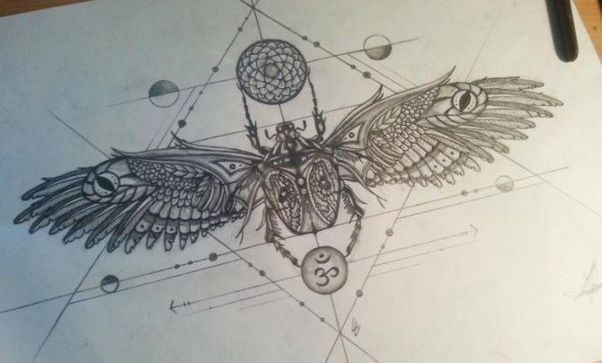 La variabilité du modèle est énorme. Cela dépend en grande partie de l'emplacement et du style du tatouage. Le scarabée se combine harmonieusement avec de tels symboles et dessins :