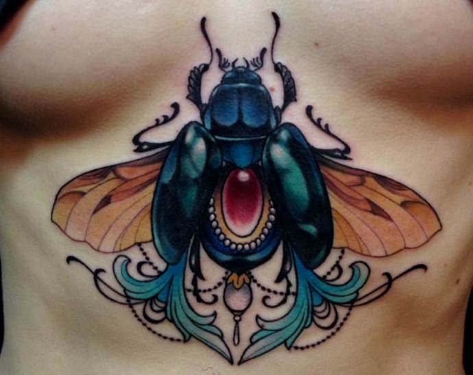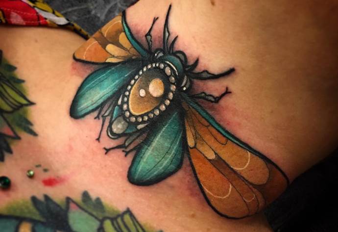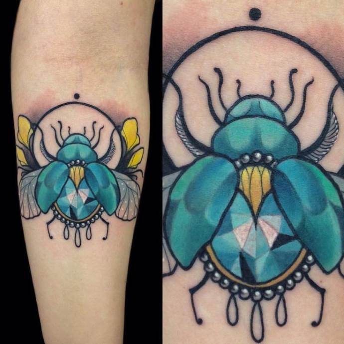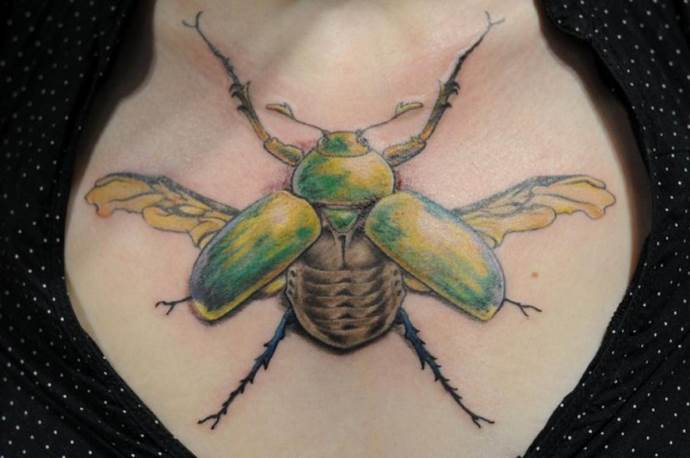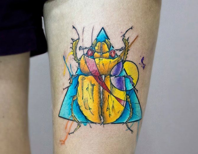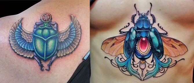 Les images lumineuses de scarabées en tatouage sont choisies par les filles, pour qui il est très important de se démarquer de la foule, de faire une impression inoubliable sur les gens. Alors qu'autrefois, les ailes scintillantes des insectes étaient utilisées pour fabriquer des bijoux originaux, aujourd'hui, l'image de créatures d'une incroyable beauté est appliquée sur la peau. Les couleurs métalliques inhabituelles, les motifs multicolores et les taches placées de manière complexe qui ornent les ailes des coléoptères sont tout aussi impressionnants que les bijoux coûteux qui ornent leur corps. C'est pourquoi les tatouages avec des insectes exotiques réalisés dans le style du réalisme sont si populaires parmi les filles.