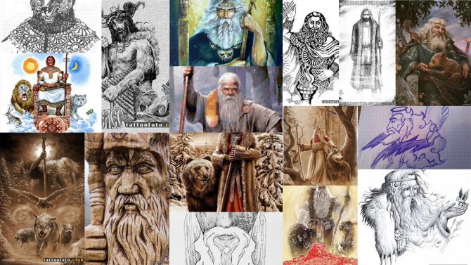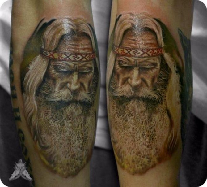 Le plus souvent, un tatouage de Veles est choisi comme une image du dieu lui-même - tel qu'il est représenté par le client, car il n'existe pas de source univoque. Selon d'anciennes descriptions, il s'agit d'un vieil homme aux cheveux gris, enveloppé de fourrures d'ours ou d'une cape, avec un bâton magique à la main. Le bâton ressemble à une massue, un gourdin ou une branche épaisse, rappelant l'élément forêt, qui est gouverné par Veles.