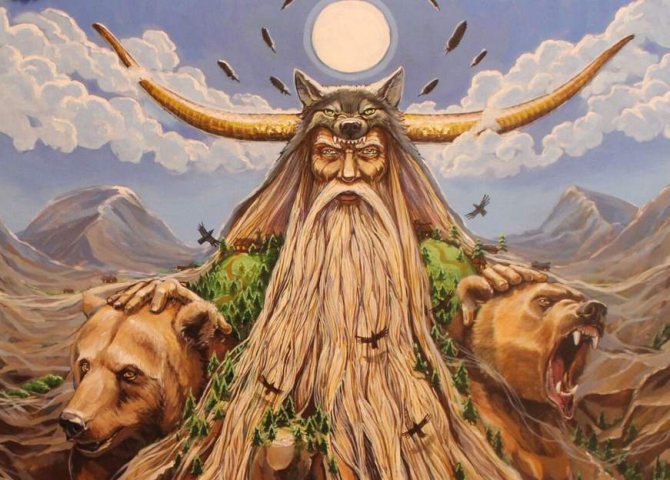 Étant à la fois un homme et un ours, ce dieu combine l'origine animale et humaine. Dans cette veine, les silhouettes d'un ours à pattes, à cornes et à poils sont souvent inscrites sans désignation.