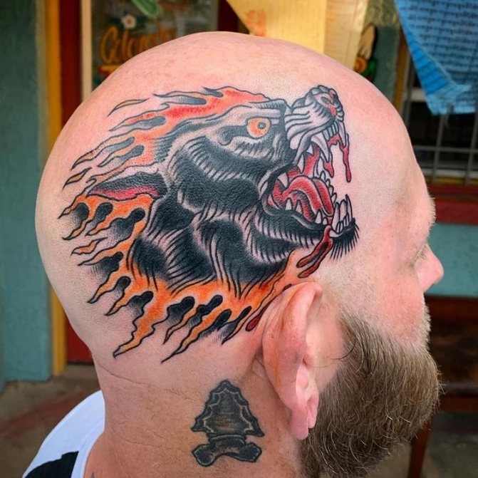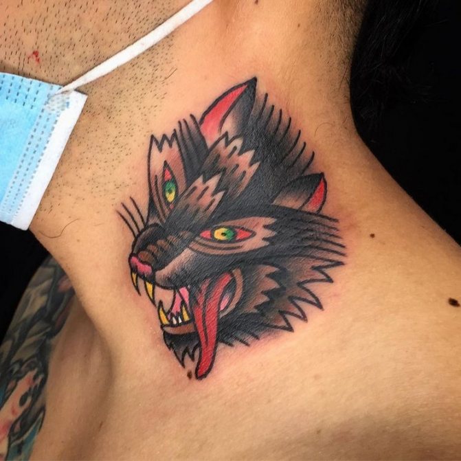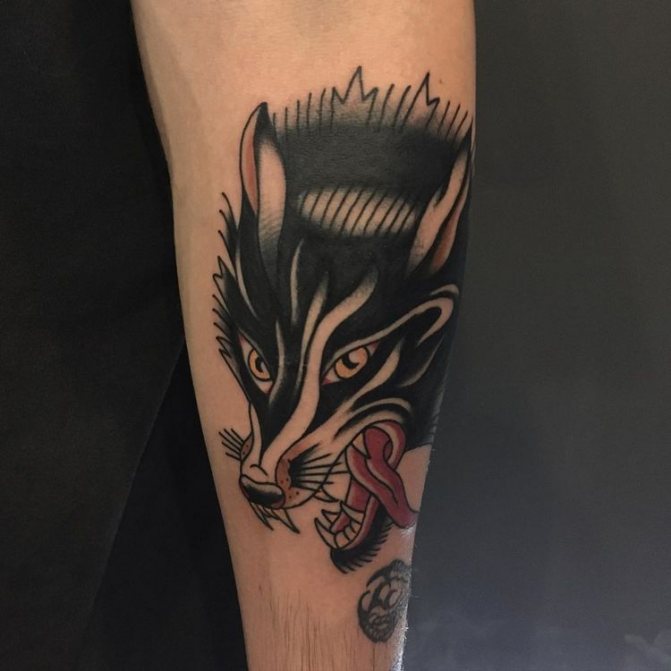 Tattoo Wolf dans le style Oldschool - est un hommage aux anciennes traditions de l'art corporel, quand il y avait certaines méthodes d'application de colorant sous la peau, les couleurs canoniques et a créé une sorte de base de données des motifs de tatouage prêt à l'emploi, dont l'un est la tête de loup.