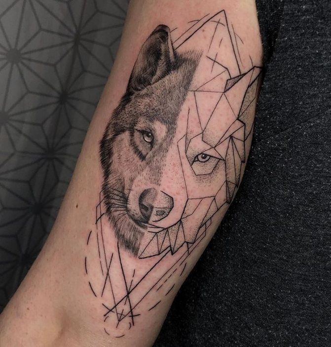 L'un des styles les plus populaires applicables aux assainisseurs de forêts. Son essence se résume à l'utilisation directe de formes géométriques élémentaires, connues de tous depuis le cours de géométrie de l'école primaire, dans des combinaisons de tatouages. Le loup est inscrit dans ces figures (le plus souvent dans le losange) ou représenté au premier plan et des éléments géométriques simples sont utilisés comme arrière-plan supplémentaire.