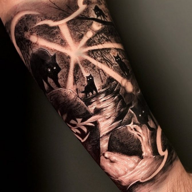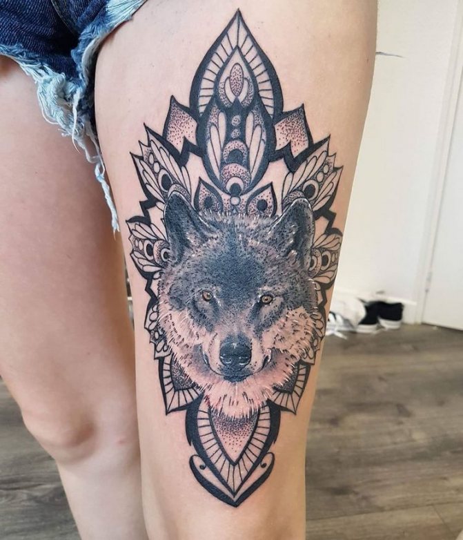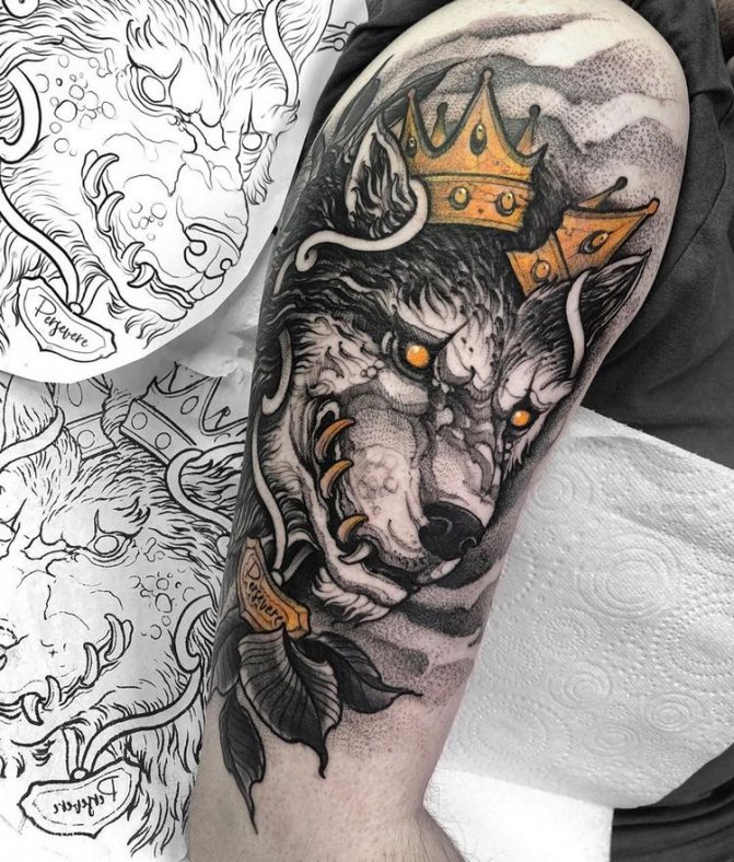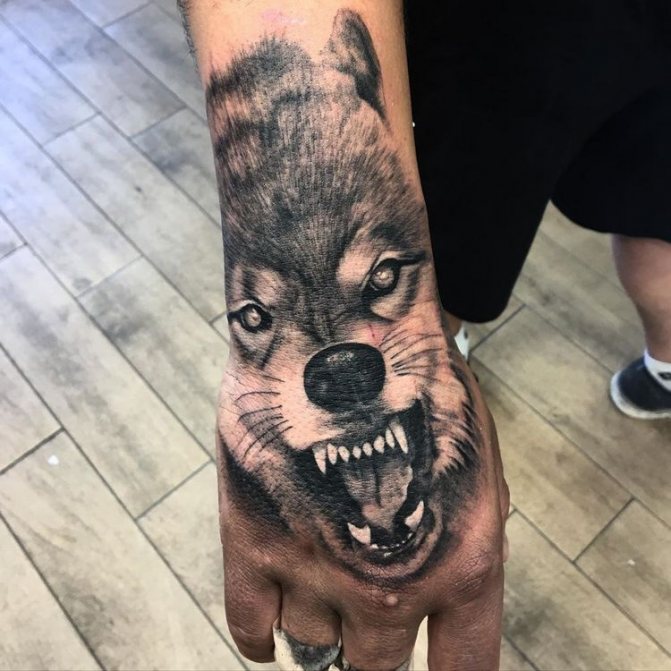 Ce motif est préféré par les personnes ayant un esprit fort, une nature audacieuse et agressive. Mais n'oubliez pas non plus que l'image exprime des valeurs familiales et culturelles. Vous pouvez choisir une image si vous voulez exprimer votre amour pour les gens, pour la nature. N'oubliez pas que, de par leur nature, ces animaux sont des prédateurs, ils ont même autrefois rivalisé avec les humains pour se procurer de la nourriture. C'est ce que l'image peut représenter :
