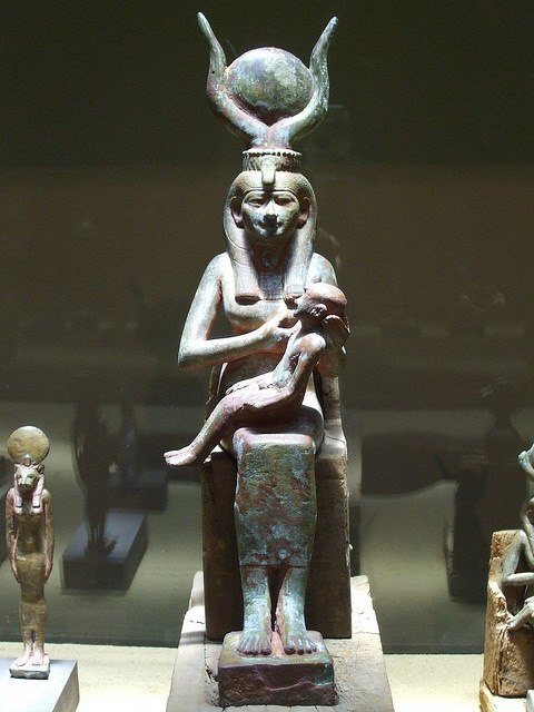 - une femme (sur un trône) avec un croissant de cornes de vache (parfois une créature avec un corps de femme et une tête de vache) nourrissant son enfant, l'enfant Horus.