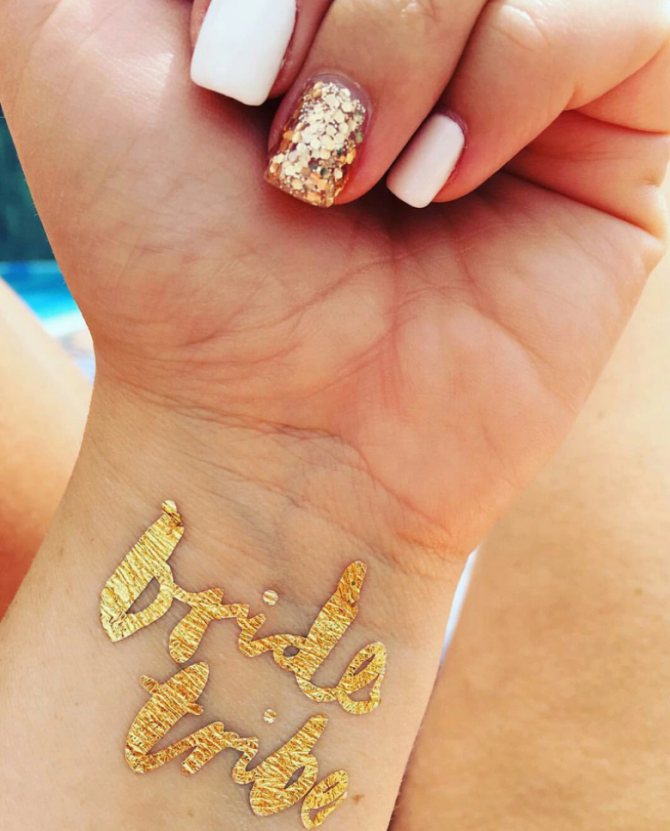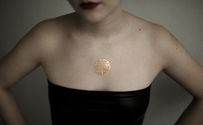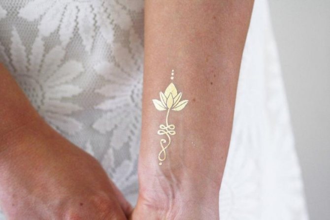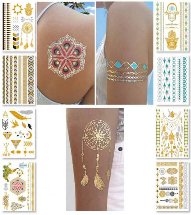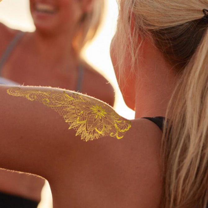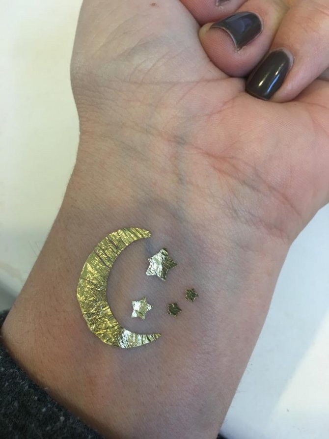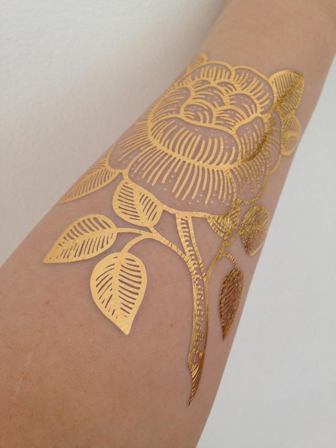 Plus tard, l'utilisation du tatouage en or est devenue accessible au grand public. À court terme, les tatouages faits d'or uni, de feuilles d'argent ont un bel aspect. Le prix de ces produits est tout à fait abordable. Surtout si l'on considère que vous pouvez coller l'image vous-même.