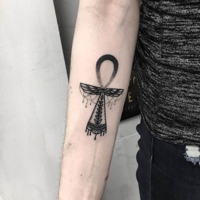 L'Ankh fait partie du symbolisme gothique, et le porteur du tatouage pourrait donc être un membre de cette sous-culture. Étant donné que la croix égyptienne est activement utilisée par les magiciens modernes, il est possible que la personne soit portée sur le mysticisme et l'ésotérisme. Parfois, la "clé de vie" est considérée comme une amulette pour attirer la chance et le bonheur, ainsi qu'une amulette contre les mauvais esprits.