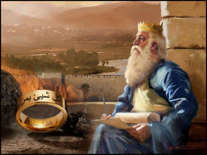La légende veut qu'au fil des ans, le roi ait utilisé le précieux anneau pour contrôler ses propres désirs pécheurs et sa colère. Mais un jour, lors d'une nouvelle crise d'agressivité, il a regardé la gravure et, au lieu de se calmer, est devenu encore plus furieux. Un Salomon enragé arracha le cadeau du sage de son doigt pour le jeter dans la rivière, mais remarqua la deuxième partie de l'inscription à l'intérieur de l'anneau - "Et ceci passera".