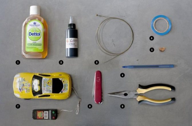 Les outils sont toujours disponibles et beaucoup d'entre eux peuvent être trouvés dans la tirelire de l'artisan. Comme les éléments principaux sont l'aiguille et le moteur électrique, vous pouvez utiliser une corde aiguisée pour la guitare n° 1 ou n° 6. Si vous n'avez pas accès à un instrument, vous pouvez le remplacer par une aiguille ordinaire du kit de perlage.