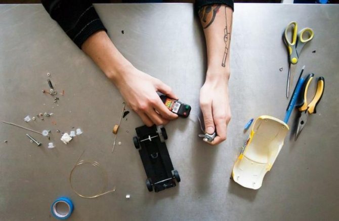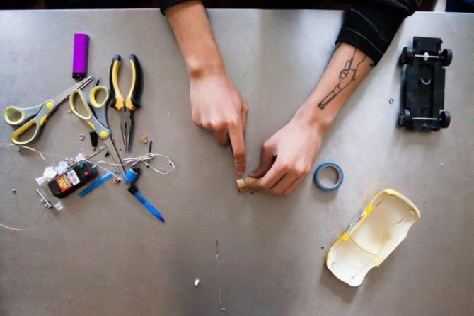 Étape 4. Un moteur est délicatement retiré d'un jouet. Il convient de noter que le résultat final dépend du type de jouet. Ainsi, dans notre exemple, nous obtenons une sorte de machine à tatouer en prison : une personne battra le tatouage, tandis que l'autre, tenant la télécommande, maintiendra constamment le bouton enfoncé. Vous pouvez également fabriquer une autre version de l'appareil.