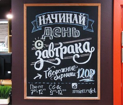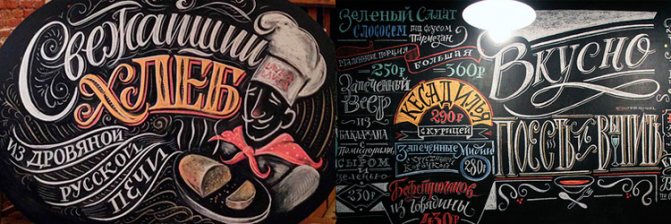 Lettrage à la craie : Largement utilisé dans les cafés et les restaurants. La craie et le tableau le plus ordinaire suffiront pour créer une inscription originale sur l'action du jour ou les nouveaux beignets délicieux, une annonce aussi originale est sûre d'attirer l'attention des visiteurs :