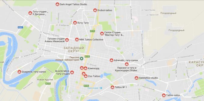 Pour moi, qui n'ai jamais eu de tatouage, le sujet est assez intéressant. J'observe également un réseau bien développé de salons de tatouage dans ma ville. Dans la capture d'écran ci-dessous, j'ai montré une concentration de ces institutions en ce moment dans ma ville (l'image peut être agrandie en cliquant dessus) :