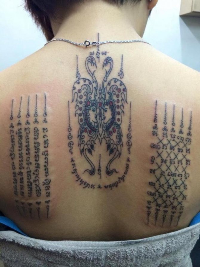 Certains journalistes ont réussi à parler aux artisans, qui ne les ont pas confirmés. Toute la puissance du tatouage mystique réside dans le motif lui-même et dans les inscriptions qui sont appliquées pendant la performance. Les inscriptions sont uniques. Pour chaque client, ils sont choisis individuellement. Pendant le spectacle, le maître récite un mantra qui ne sera pas répété pour une autre personne. Il faut savoir qu'à première vue, des tatouages absolument identiques les uns aux autres ont une signification complètement différente et agissent différemment sur leurs propriétaires.