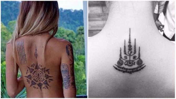 Un motif créé selon un symbolisme géométrique. Les moines bouddhistes ont le droit de faire un tel tatouage exclusivement pour les personnes de sexe masculin. Les maîtres tatoueurs peuvent appliquer le motif sur le corps d'une femme. Mais il est strictement interdit aux vrais moines d'avoir une telle procédure.