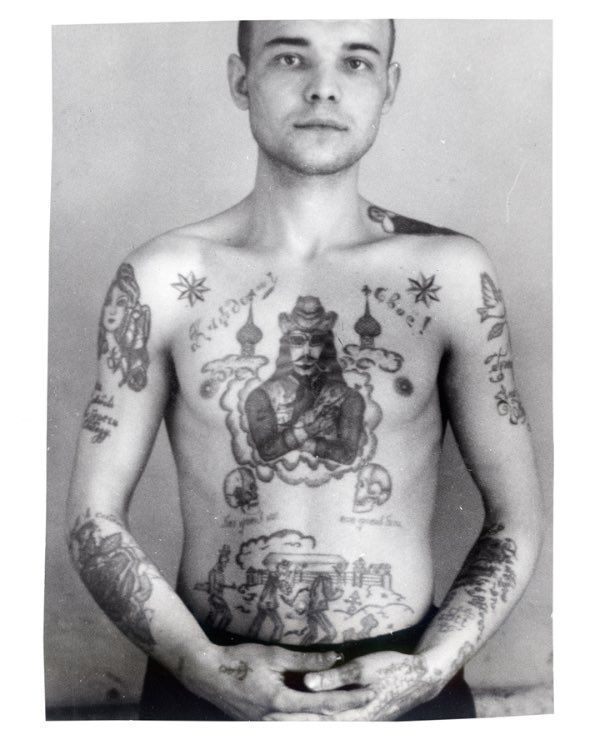 Sur le bras du prisonnier, sous son crâne, est inscrite la phrase latine : "Momento Mori", qui signifie "souviens-toi de la mort". L'aigle bicéphale est le symbole de l'État russe. Il a été introduit au XVe siècle par Pierre le Grand. En 1993, après la chute du système socialiste, il a remplacé le marteau et la faucille comme emblème de la Fédération de Russie. Cette photo, prise pendant la période soviétique, montre ce tatouage comme symbole de la colère contre l'URSS. Le tatouage peut également être interprété comme suit : "La Russie pour les Russes". La Statue de la Liberté symbolise le désir de liberté, tandis que le sinistre personnage tient un pistolet et signifie une volonté de violence et de meurtre. Les yeux sur sa poitrine signifient : "Je peux tout voir" ou "Je regarde" - le tatouage autoritaire d'un "regardeur" criminel. Les étoiles à huit branches sur les épaules indiquent que le porteur est un voleur "autoritaire".