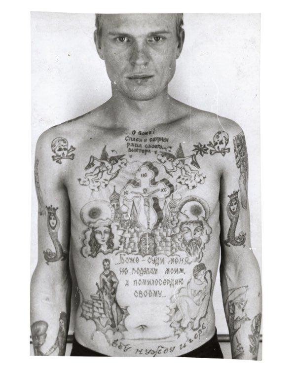 Le crâne et les os croisés sur les épaules de ce prisonnier indiquent qu'il purge une peine de prison à vie. Une seule étoile à huit branches indique qu'il est le "surveillant" parmi les voleurs. "Fille s'accrochant à sa robe avec une canne à pêche" sur l'avant-bras gauche est un tatouage porté par les brutes et les violeurs. Les serpents enroulés autour de restes humains (situés sur le tiers médian de chaque épaule) sont une variation sur le thème des anciens tatouages de voleurs. Le serpent est un symbole de la tentation, mais la tête du serpent a été remplacée par celle d'une femme - une séductrice. Le tatouage sur le côté droit de son abdomen est une variation de la Judith de Giorgione (1504) et symbolise la tromperie sous la forme d'une femme séduisante qui trahit un noble. Le texte au-dessus de la croix se lit comme suit : "O Dieu, sauvez et préservez votre serviteur Victor". Le texte ci-dessous se lit comme suit : "Ô Dieu, ne me juge pas selon mes actes, mais selon ta miséricorde". Le texte au-dessus de la gaine se lit comme suit : "E*u need and grief".