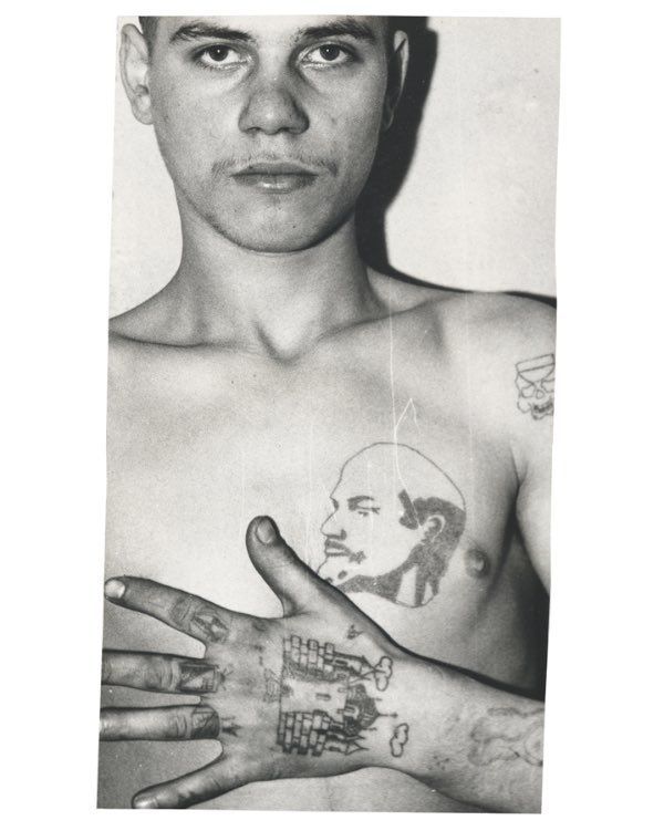 Le tatouage sur l'index de ce prisonnier est une variante de l'"anneau du déni", indiquant l'hostilité envers les forces de l'ordre et le régime. Sur le majeur : "Liberté de juvénile" ou "J'ai acheté du temps et je vais voler". Sur le modèle sans nom : "Broken Youth" - le porteur a été condamné en tant que mineur. Les cinq points sur le poignet sont un signe courant pour ceux qui connaissent le régime carcéral. Ils signifient "quatre tours et moi" ou "j'ai traversé la zone" d'un détenu qui a purgé sa peine comme travailleur correctionnel ou dans une colonie pénitentiaire. Lénine est perçu par de nombreux criminels comme le "Pahan" du parti communiste. Les lettres BOP, qui sont parfois peintes sous son image, ont une double signification : l'acronyme signifie "Leader de la Révolution d'Octobre" ou signifie littéralement "GOR".