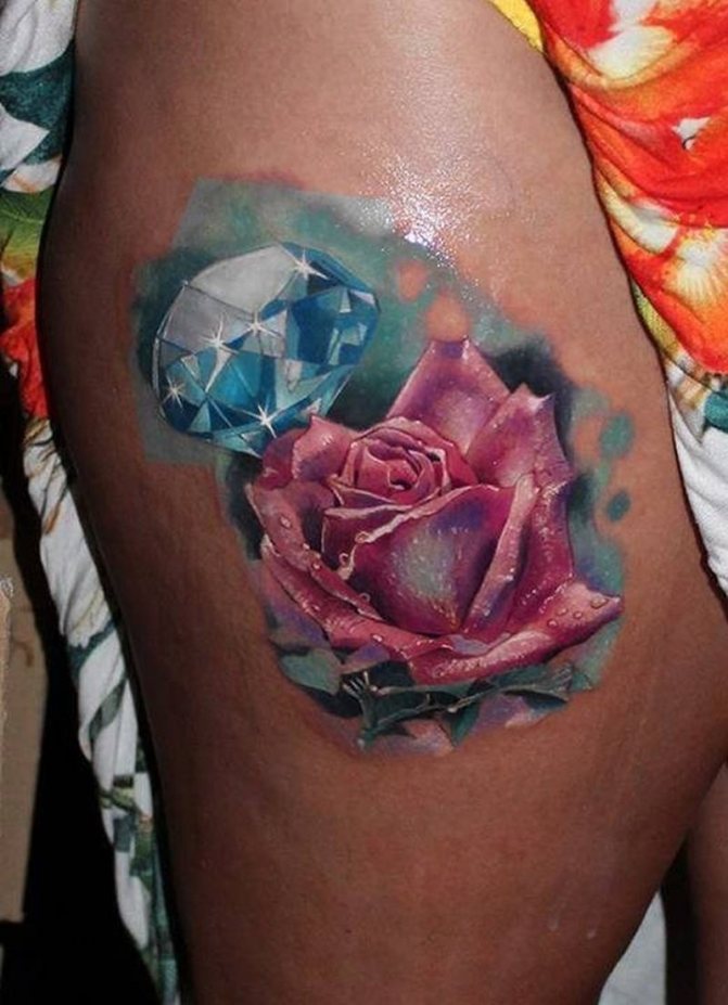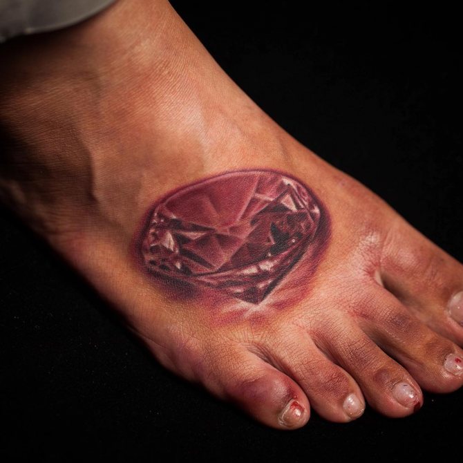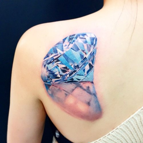 Les amateurs d'expériences et d'indignation publique adoreront la nouvelle technique 3D. Grâce au positionnement correct de la lumière et de l'ombre, le diamant semble flotter dans l'air au-dessus du corps. Ce tatouage optique est si frappant que l'on a envie de toucher l'image avec la main et de constater par soi-même qu'elle existe. Ce dessin complexe ne peut être réalisé que par un artiste compétent ayant le sens du détail.