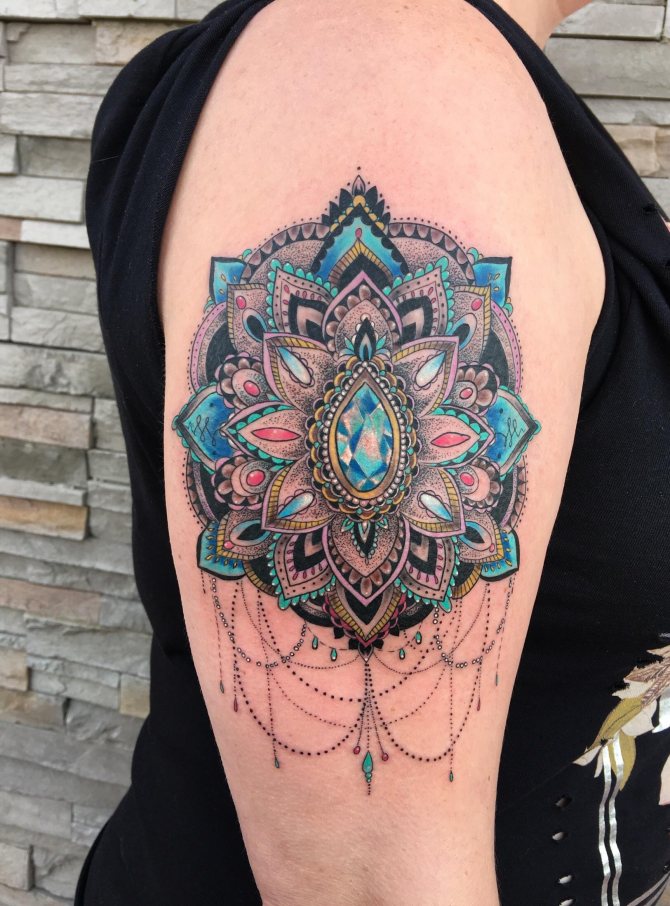 On pense que les hindous sont à l'origine du tatouage en forme de diamant. Cela s'explique par le fait que le minéral a été exploité pour la première fois dans leur pays. Les Hindous ont donné au diamant d'incroyables propriétés magiques. Dans le monde d'aujourd'hui, les images de tatouage de mandalas hindous avec un beau diamant sont préférées par les femmes. Ce tatouage est brillant et attrayant sur la main, l'avant-bras, le poignet, la hanche ou les côtes. Le tatouage mandala diamant hindou sur le corps féminin sous les seins est sexy et séduisant.