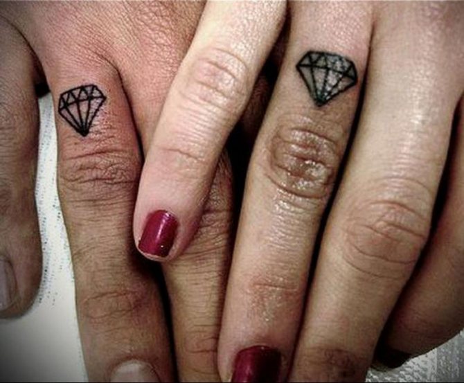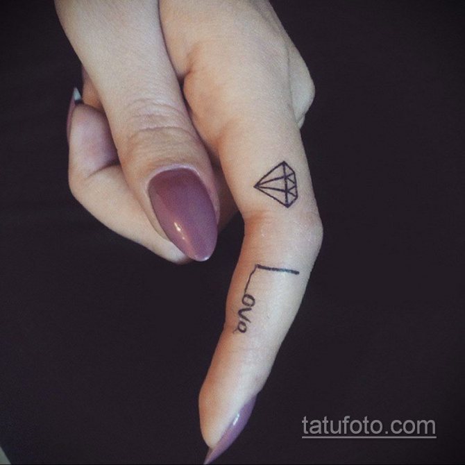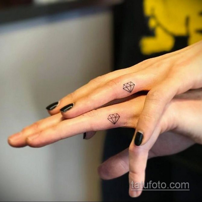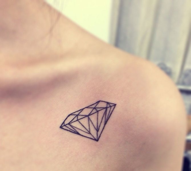 L'image du diamant, grâce à ses facettes claires et plates, présente une géométrie originale et un style linéaire. La présence de lignes droites permet la formation d'un motif unique et distinctif. Les esquisses sont aussi belles en noir et blanc qu'en couleur. Il est préférable de réaliser un tatouage schématique à petite échelle. Pour une fille, ce sera une décoration corporelle exquise qui accentuera sa fragilité et sa grâce.