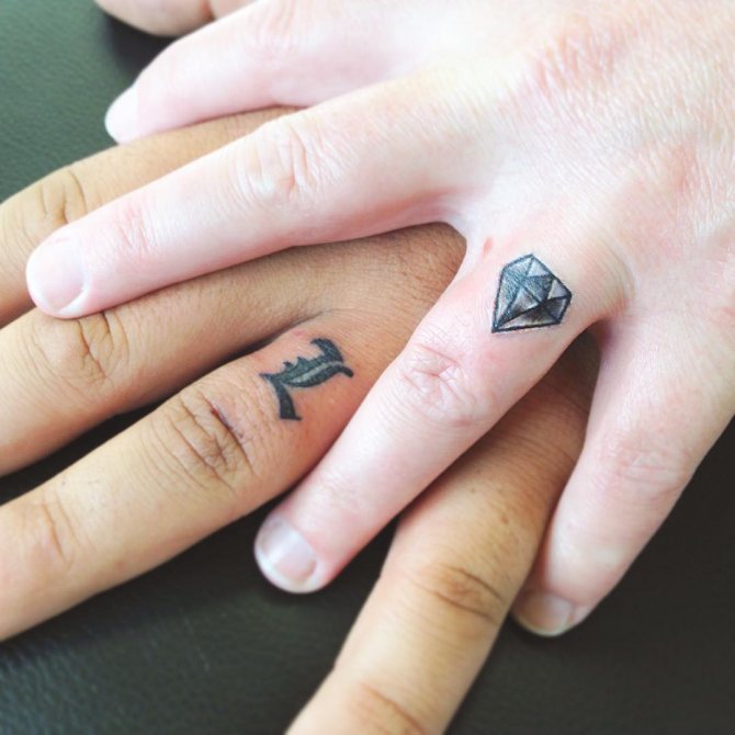 Les hommes préfèrent le tatouage "diamant", d'une beauté naturelle. Les hommes aiment les tatouages bleu foncé ou noirs. Les femmes s'arrêtent au choix des "diamants" de petite taille et placent leurs images sur la hanche, le tibia, le pied.