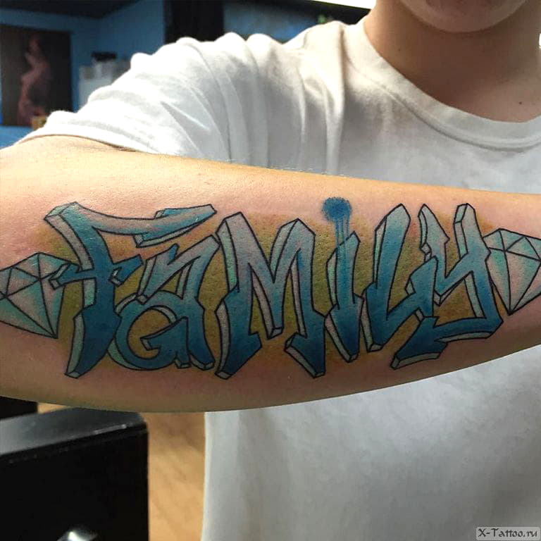 - Graffiti. Cet art de rue a rapidement fait son chemin dans la culture du tatouage également. L'idée de base est une combinaison de l'écriture et du dessin.