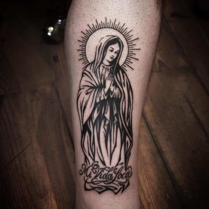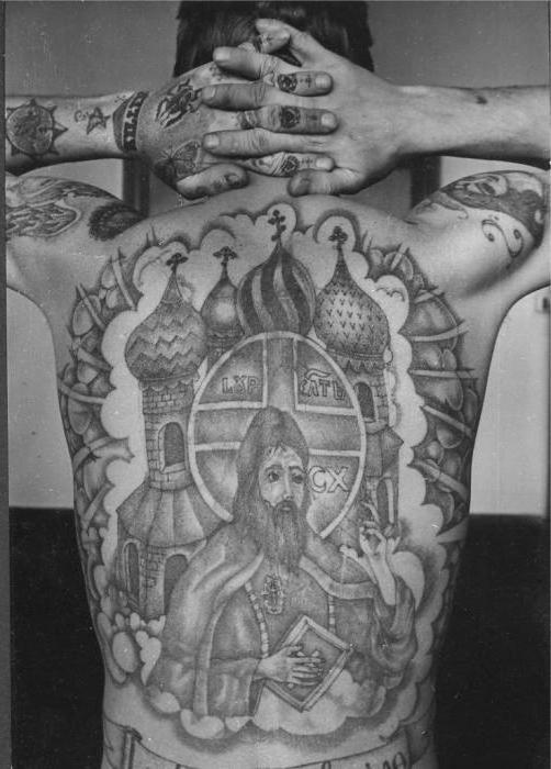 Une image de la Vierge Marie avec une croix et un dôme d'église en arrière-plan a une signification emprisonnée. Ce tatouage est presque toujours porté par des hommes qui ont été incarcérés. Ils ne contiennent aucune signification chrétienne, mais uniquement des symboles associés à la sous-culture carcérale. Ces tatouages sont de grande taille.