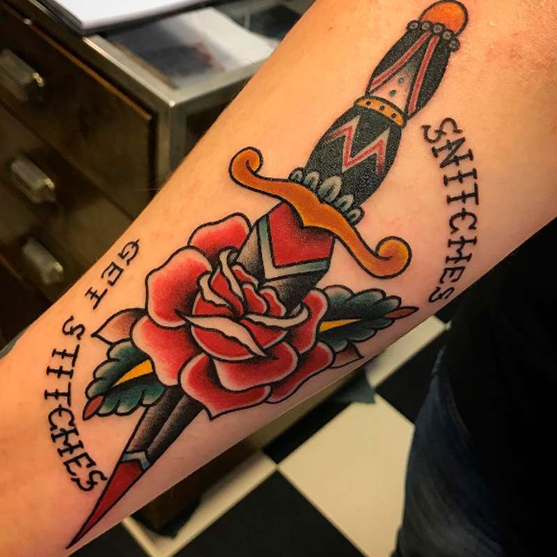 Il existe une théorie selon laquelle les propriétaires de la rose avec un poignard ont vécu une trahison, pour laquelle ils ont dû verser du sang. Le plus souvent, on trouve ce type de tatouage dans les styles classiques (traditionnels) - old skool et new skool. Une telle variante se caractérise par des contours audacieux, des couleurs vives, l'absence de transitions douces et d'ombres.